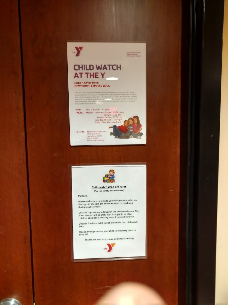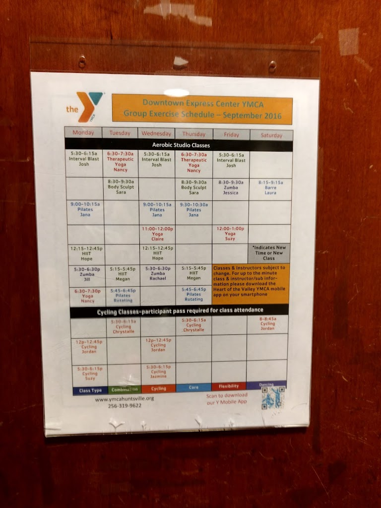 The Downtown Express YMCA in Huntsville, Ala., features cardio equipment, free weight areas, ActivTrax, aerobics and spin classes, locker rooms with showers, saunas, and steamrooms, complimentary Child Care while you work out, and reciprocal membership at our branches in Southeast Huntsville and Madison.