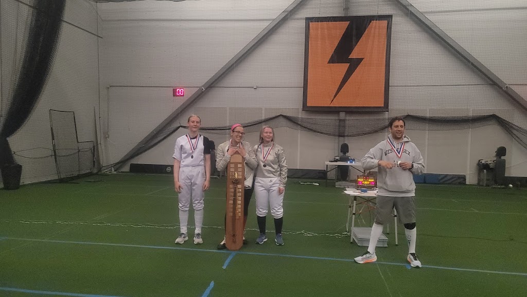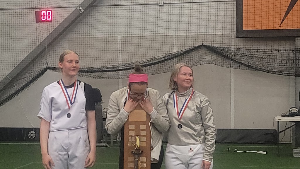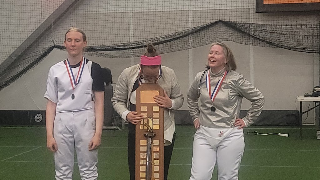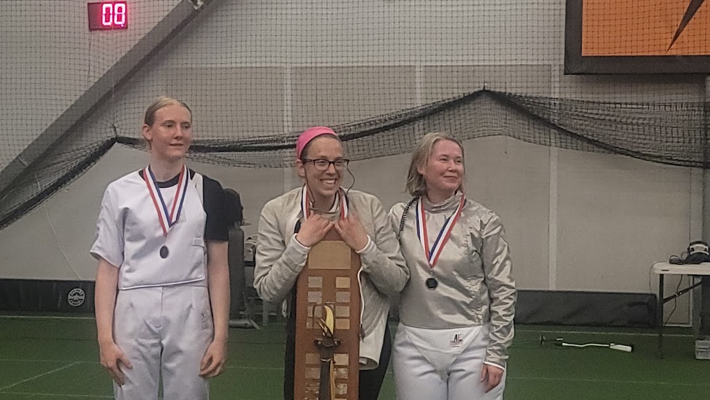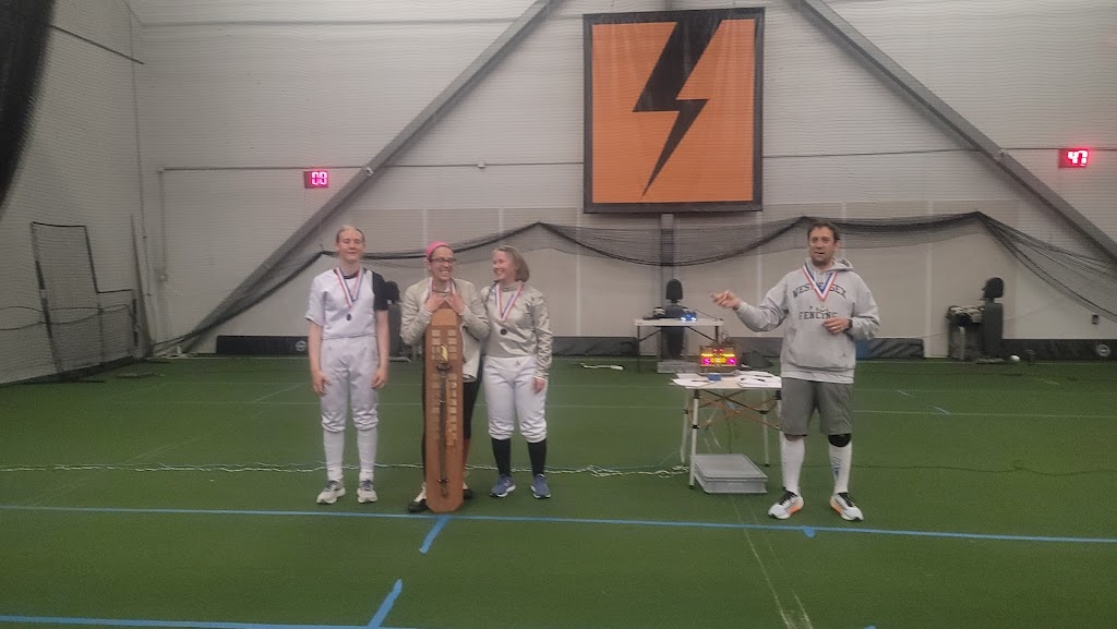 Astroturf was interesting to fence on, but the washroom facilities were very deluxe with each having a shower and towels. The floors were very clean and there was plenty of parking for all the participants.