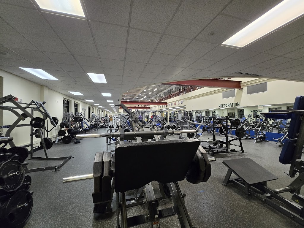 Quality base gym with plenty of benches, racks, machines, and amenities, such as a pool, racquetball courts, basketball courts, and and indoor running track.