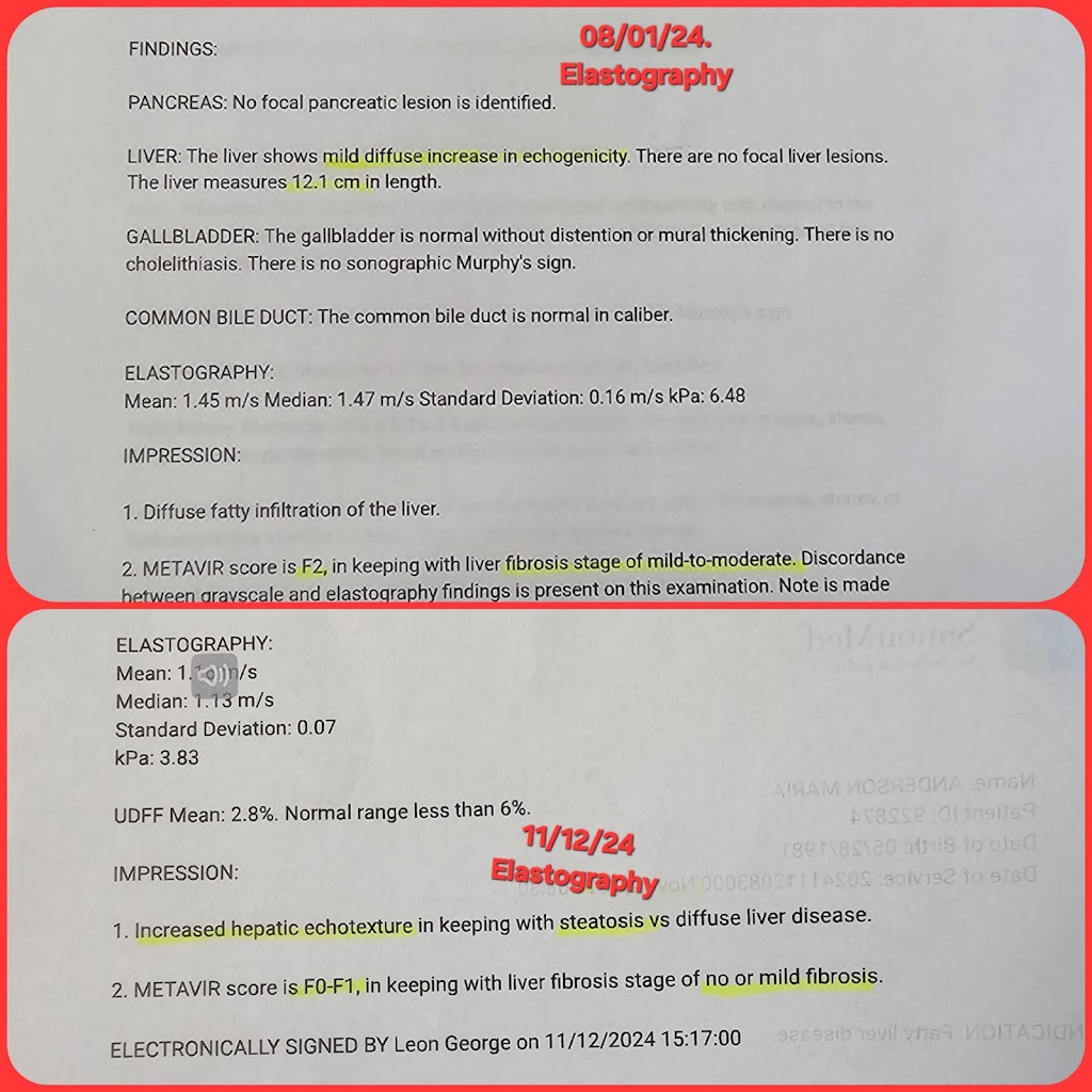 So I did not go back, instead, I read about health and nutrition and listened to functional / holistic doctors who ate good at preventative measures. I fasted, changed my diet, took supplements that I know can help me, and I started hiring Todd of LA Fitness for body building. 3 months later, my F2 fibrosis went down to F0-F1. And this was in 2024. I am writing this now in 2025. I feel good now. My liver is healing. My body heals itself with proper nutrition, healthy lifestyle, and avoiding foods and things all around with chemicals. The foods here in USA are just almost all junk. The high fructose corn syrup are placed everywhere--your ketchup, your barbecue sauce, your supplements, your starbucks drinks, chocolates, etc. and it's killing your liver, giving you and your children fatty liver disease, diabetes, etc.