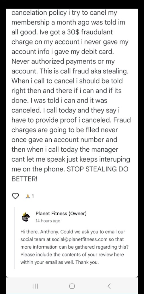 I have been a member of Planet Fitness on and off for years, and I am extremely unimpressed by the lack of professionalism at this location. There was a billing error made by Planet Fitness when I cancelled online, and a late fee was charged to my account without warning. Planet Fitness did not complete the auto withdrawal from my bank account on the 17th, as usual, for September’s payment, although no notice of this change in the billing procedure for my last month was listed in either of the cancellation confirmations that I received. I tried to resolve the issue numerous times over a full week, by going into the club, calling, and emailing multiple times, but only received a call back tonight from the assistant manager, after I called the club once again. He told me that both he and his boss (the manager) cannot help me, and then blamed the error that Planet Fitness made on my bank, which is blatantly untrue, since the account is still linked for auto pay. I asked who I could contact to resolve this, and he unhelpfully said I could try to speak with customer service, but that they would just send me back to the club, and no one there could help me. My experience has been very disappointing, and honestly the assistant manager wasn’t helpful or professional in the least. To tell me that management at the club can’t waive fees because corporate is “cracking down,” but then also telling me in the next breath that all decisions go through each individual club so I can’t contact corporate, is absolutely ridiculous, and makes no sense. I guess when you purchase a cheap gym membership, you can’t expect good customer service. I was always a big fan of Planet Fitness, but this has definitely soured my opinion.