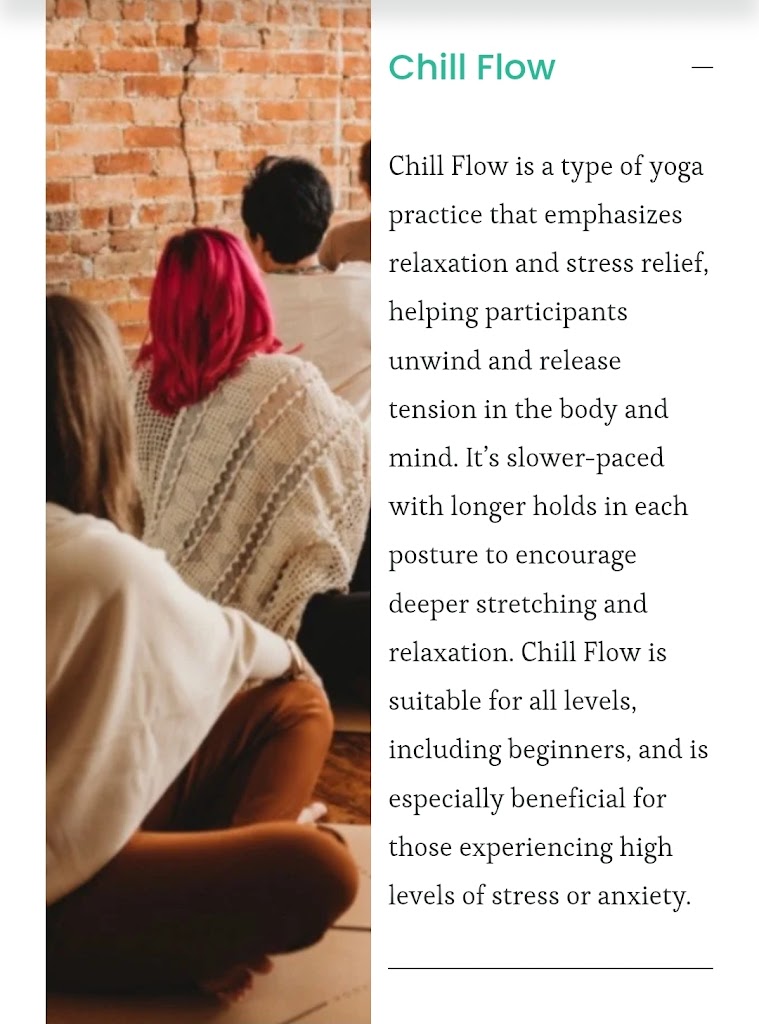 Amazing place!!! When you go in for yoga, you leave all your stressors at the door. I love how relaxed and at peace I am when I leave. Plus, I can even get my retail therapy done after my class. They have some of the most comfortable cloths. I love chill and flow plus balance and align classes. I always feel so relaxed after yoga.