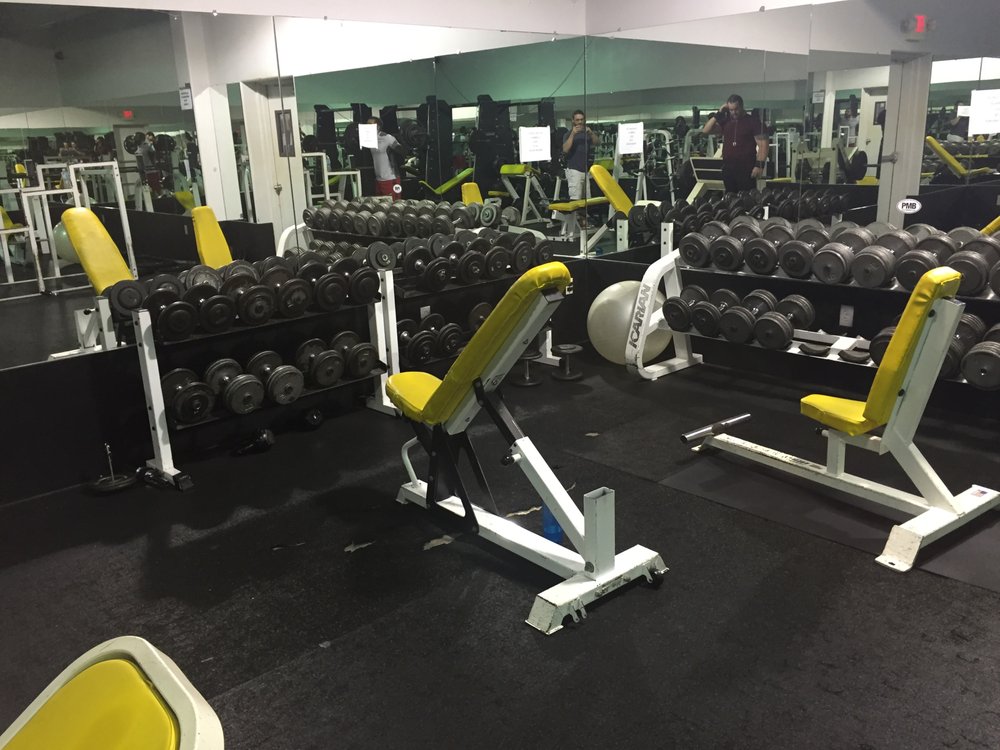 Absolutely horrible place. Steam room is still not fixed. Plates are rusted. Barely enough room to walk around free weight area. Weights are not put up at night. Only 1 water fountain that does produce cold water. Broken handles for pull weights.