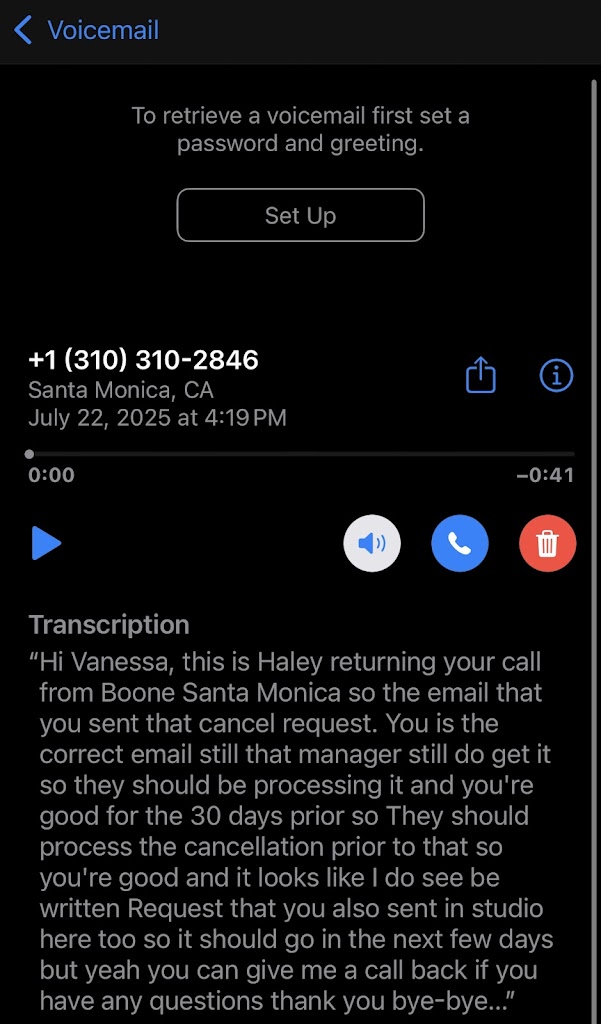 I provided handwritten notice (delivered in person to the studio)and notice via email of my request to cancel my membership. They have never acknowledged any of my emails. The only proof I have is a screenshot of a voicemail a front desk associate left me saying management confirmed my cancellation request.