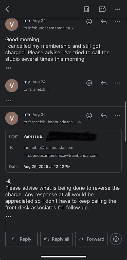 TLDR: Bunda is great if you like a lot of rules that are inconsistently enforced. If you are new to working out in general, this may be a good option. If you are not new to working out, you will know that you don’t burn enough calories to lose any weight and may be annoyed with the constant preaching. Predatory business tactics- they refuse to acknowledge my cancellation requests. See screenshots.