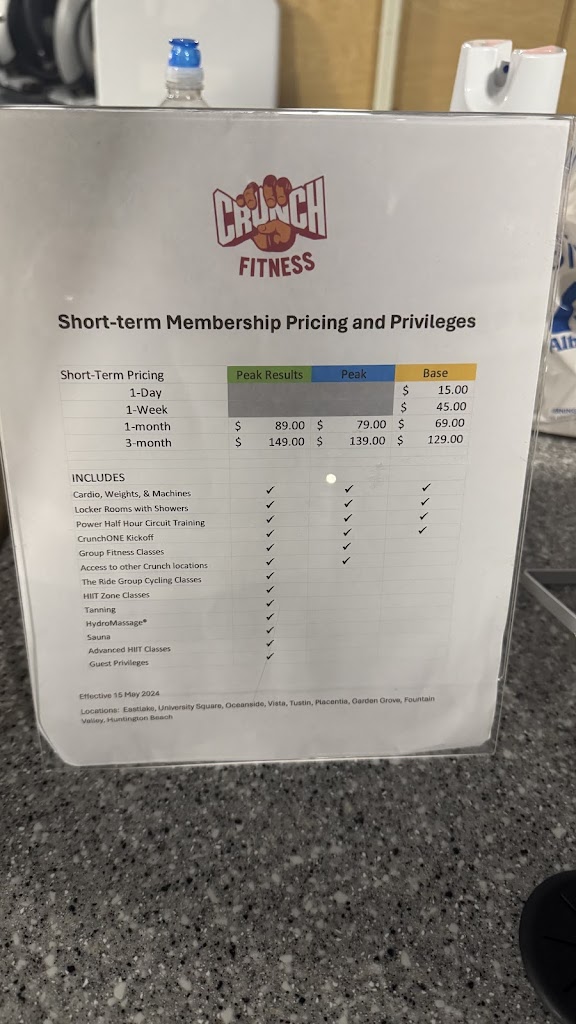 I came to this Crunch because it’s larger than the Serra Mesa one. I would like to add some constructive criticism. I don’t think all the space is being utilized, I think at least one or two more platforms can be added. The back corner towards the second platform you could for sure add at least one more platform. The two smith machines can be pushed closer together and potentially add another one. The turf area is nice, but I didn’t see any j- hooks to set up a barbell there to squat or whatever. I think the kettlebells should be moved to the turf area as well. The dumbbells were all out of order as well as the plates. When I went in the bathroom one of the toilets was clogged. The only barbell they had were deadlifting barbells, which are thinner and harder to squat and bench with.