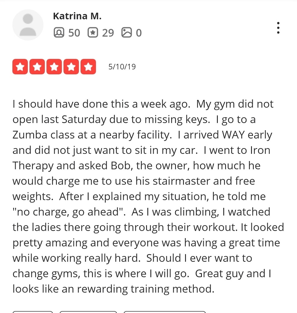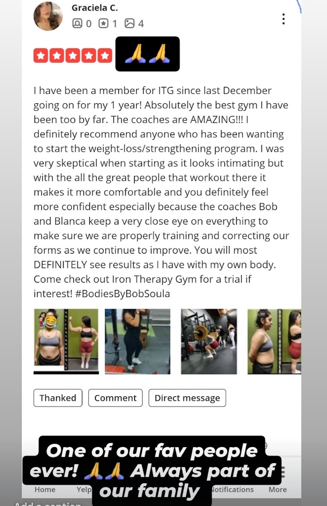 I’ve been part of Iron Therapy Gym since first week of February and the reason I got to join the gym was because my sister told me about it, she has been a memeber of this gym for over a year and she loves it. I’m glad I joined because coach Bob has helped me get better at working out. He guides everyone to do works outs the right way and pushes you to your limit, which is one of many things I like about his training. He shows that he cares for his clients and tells you exactly what he expects from you every day you come in for a work out. He wants to see results in you. He is just great. Also I love the people I work out with , everyone is friendly.