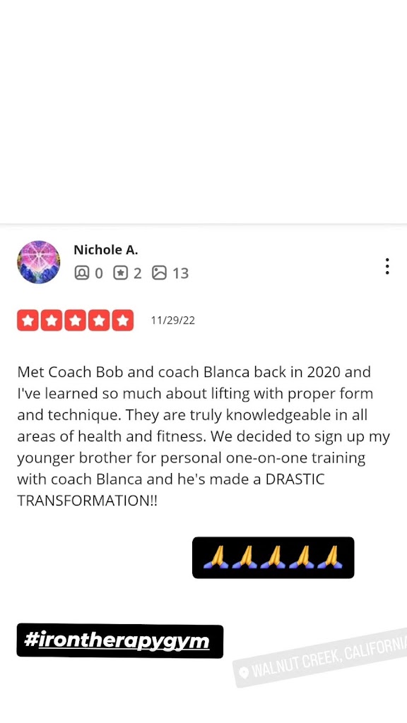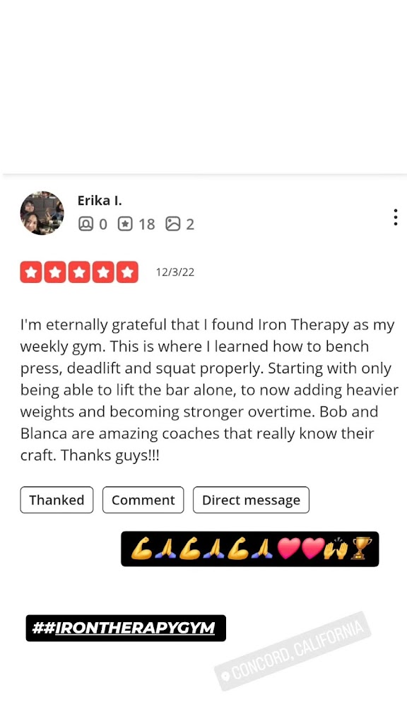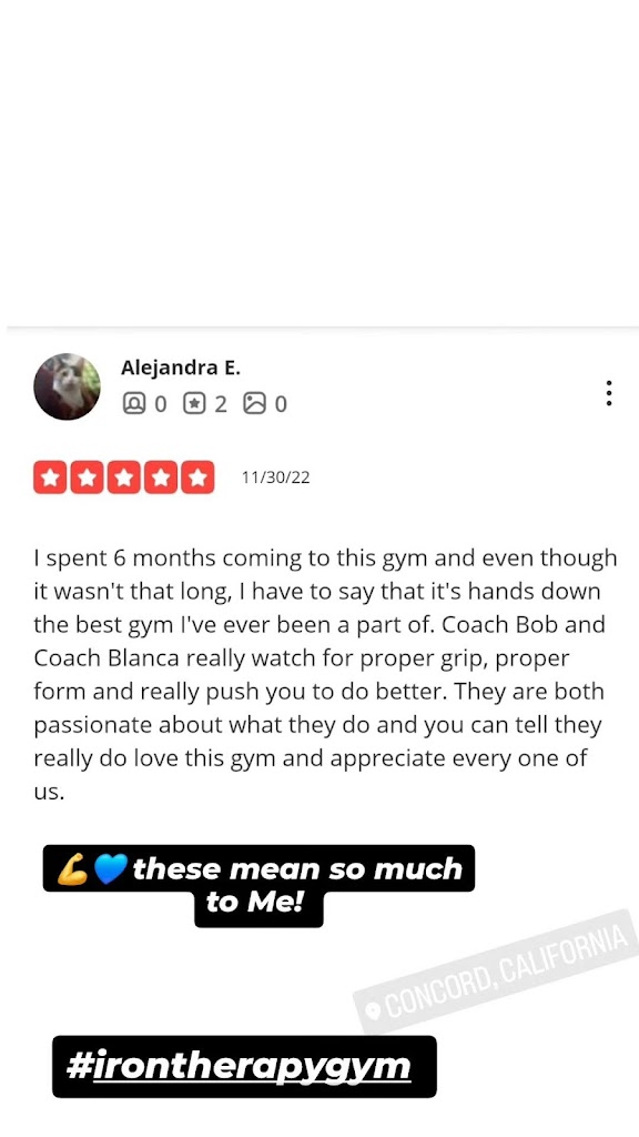 I joined iron therapy gym two years ago joining this gym has truly changed My life and completely transformed the way I left. I’ve learned so much from Coach Bob, his knowledge guidance and support have pushed me to new levels I didn’t think I could reach. I am beyond grateful for everything he’s taught me. what I also love is the energy in the classes. Everyone motivates each other and it feels like a real community, the atmosphere makes working out fun while still pushing you to give your best. I genuinely look forward to every session and I couldn’t recommend this gym more. I never felt more supported or inspired in a gym environment, such as IRON THERAPY!!!!