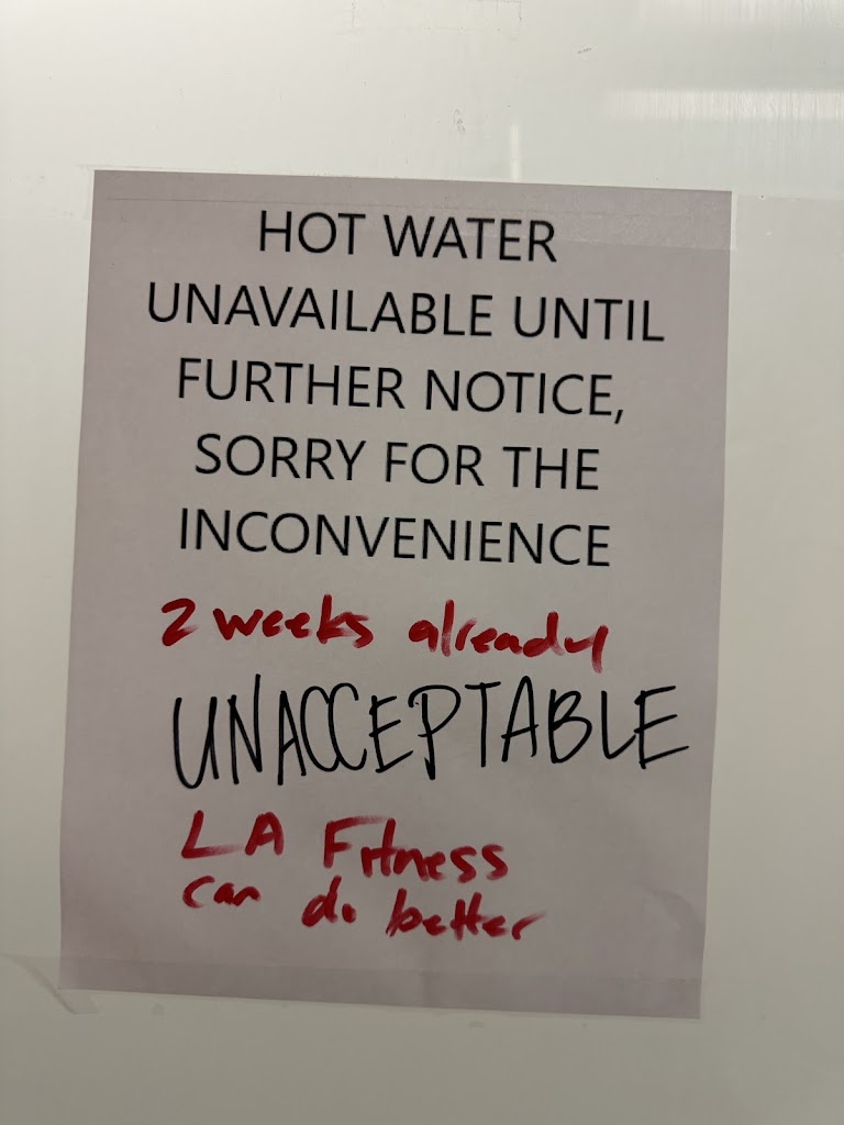 The hot water has been non-existent in the men’s showers for over two weeks, machines have been out of order for about as long. A lot of staff members yapping away at their desks but none of them can get on the phone to call a damn handyman.