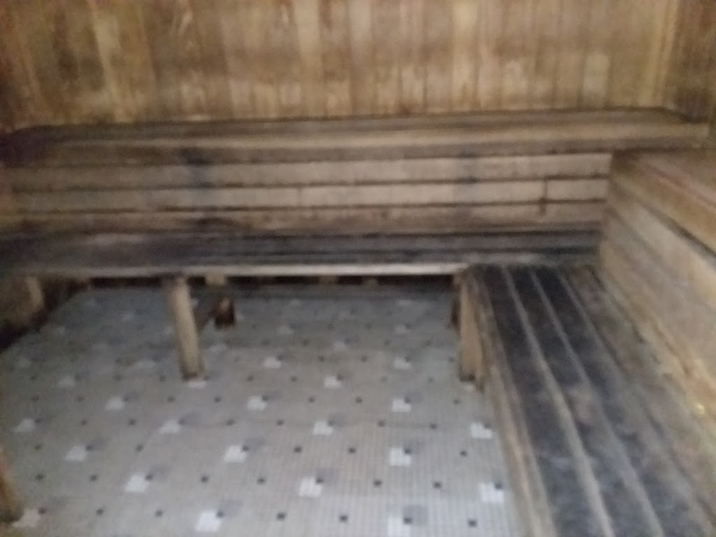 The sauna wooded benches are black from how dirty they are. You can't even see the brown wood.
