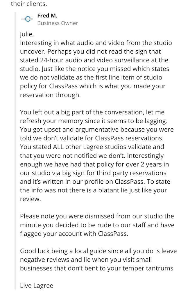 There are many other Lagree studios that handle clients with professionalism and care; Iβd recommend supporting those instead.