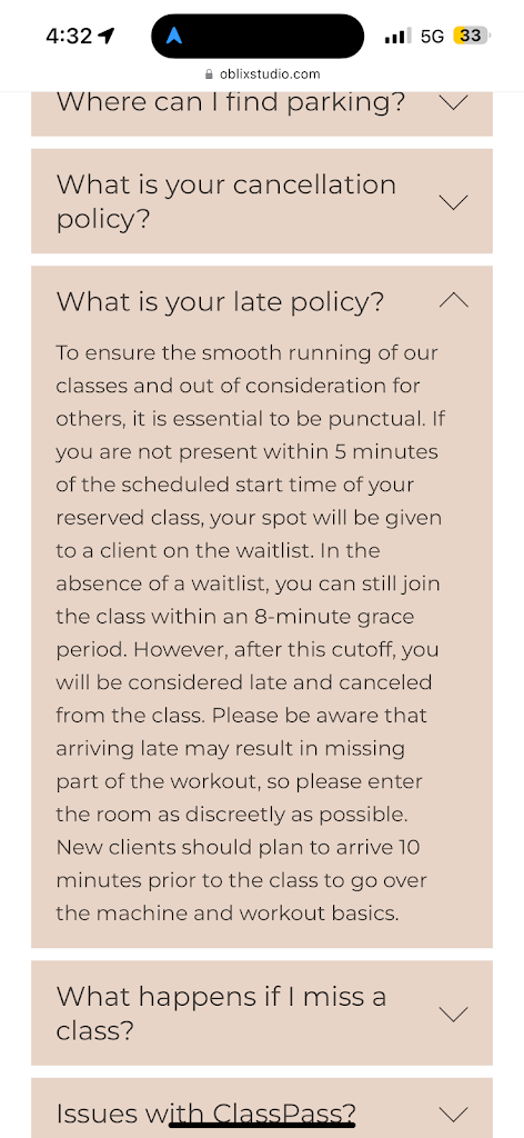 I’m truly so disappointed in this experience and frankly embarrassed that it was handled in this way. They ignored their own rules and my small window of time to work out was taken away. For the price of this studio I expect better client care.