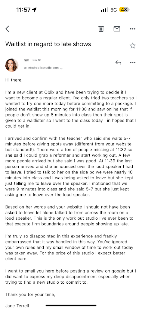 Based on her words and your website I should not have been asked to leave 10 minutes into a workout let alone talked to from across the room on a loud speaker in front of everyone. This is the only work out studio I’ve ever been to that fails to execute firm boundaries around people showing up late.