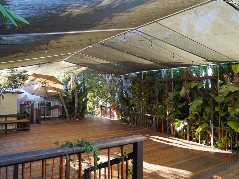 The outdoor deck is a beautiful place to practice yoga. Love hearing the seagulls and palm trees swaying in the wind. The live music (guitar) is a lovely touch in some of the classes.