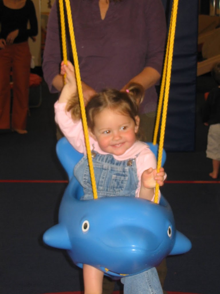 Once at My Gym, the kids kick off their session with circle time of stretches, dances and skill practice, followed by activities that change virtually every ten minutes. From mini-zip lining to swinging in animal-shaped swings to balancing on boards, the kids pack in a lot of activities, all leading to independent time where the adults sit back and the children develop their inner resources, exploring a tub of toys, including the teapot my grandson loves to use to pour imaginary tea.