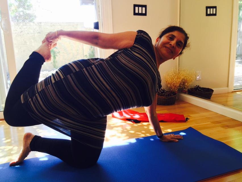 she teaches me yoga,teaching me some yoga relese back pain.she likes sharing things , she dedicated to yoga a lot .she also is a vipassana meditate,she always be happy,be nice .