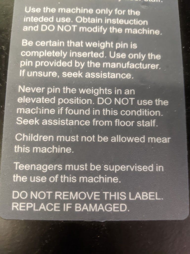 Many plate loaded machines require the use of clips to keep the plates on the horn pins on at least one side of the machine. If this clip was not used, the plate would work itself off.This is inexcusable. If the owner wants to keep claiming that his equipment is not shoddy and cheap, then I implore him to show me proof. Quality equipment comes with markings of the manufacturer, a serial number, and text written in proper english. As far as I know, “BAMAGED” is not a real word (see photo). My reason for cancellation was not feeling safe in this gym using this equipment. When I called to cancel I told the owner this and that I did not see the equipment getting any better. The owner actually said during that call “yeah I know what you mean”. Admitting fault to being a cheapskate, nice.