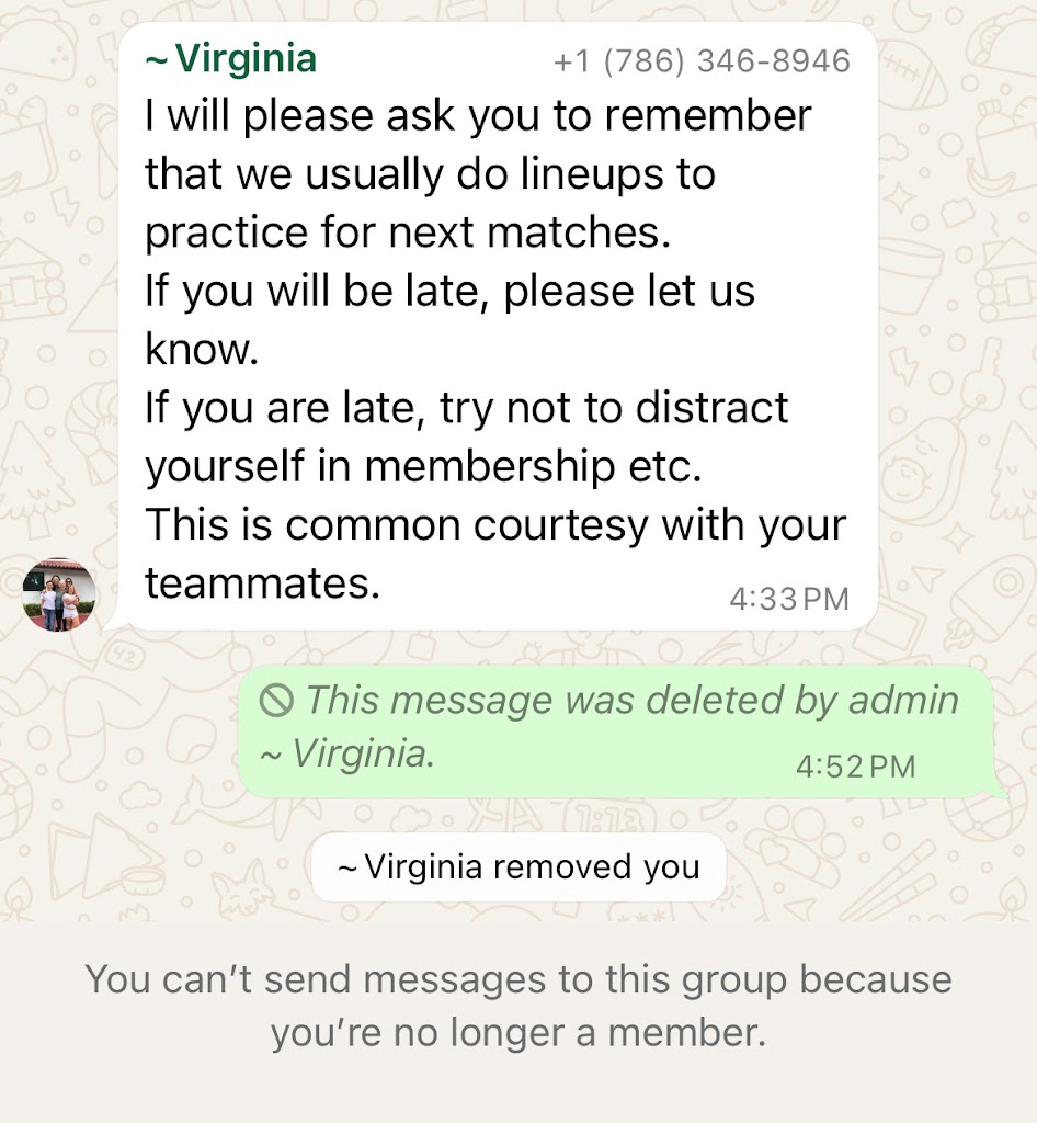 The following week a chat was sent out about signing up for practice and she added a note indirectly insulting me again about being late. I responded to her reiterating my situation last week and told her to have compassion for others. She deleted my message and removed me from the practice chat group and told my team captain that she is not putting me back on and I canβt come to βherβ practice.