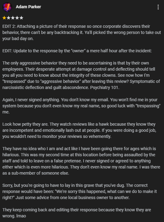The "owner" of this location fraudulently had my original review I posted on the wrong account taken down, so I'll put it here in photo format, on my high-level Guide account, so that happy little mistake can't happen again. I'll also include their response as the second photo.