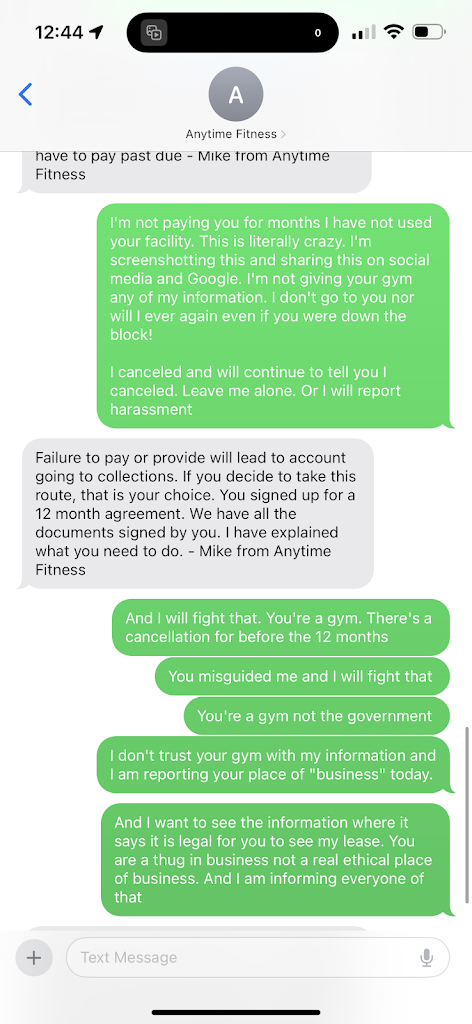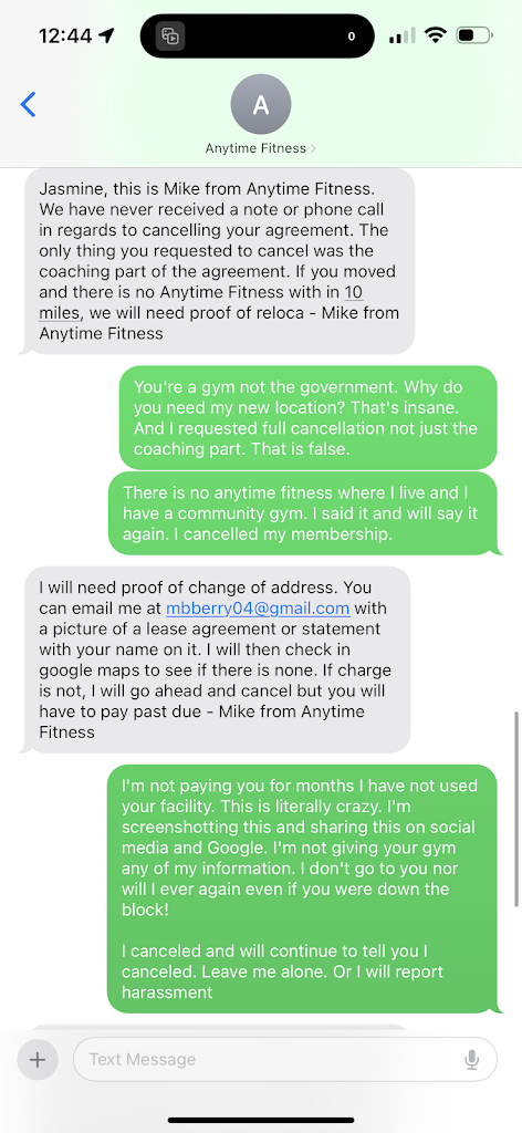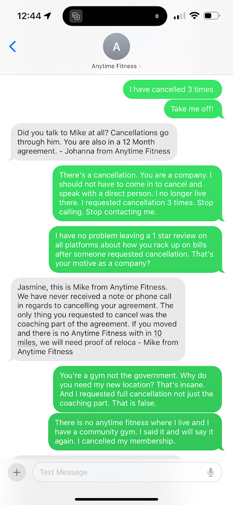 I've tried multiple times to cancel my membership. They stated that I had to move not within 15miles of an anytime, bring in a doctors note or pay for the rest of the year. I bring in a doctor note. They stated it wasn't specific enough. That because it doesn't say I can't use all of the equipment "bands, treadmill". They weren't going to cancel my membership. They are purposely making things difficult to get more money.