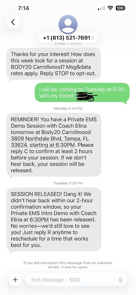 I highly recommend Body 20- Carrollwood. The trainers are excellent and Stafford and Meya are great. No matter what challenges I encountered, Meya went the extra mile to make things right. If you stick with it, you will definitely see and feel results.