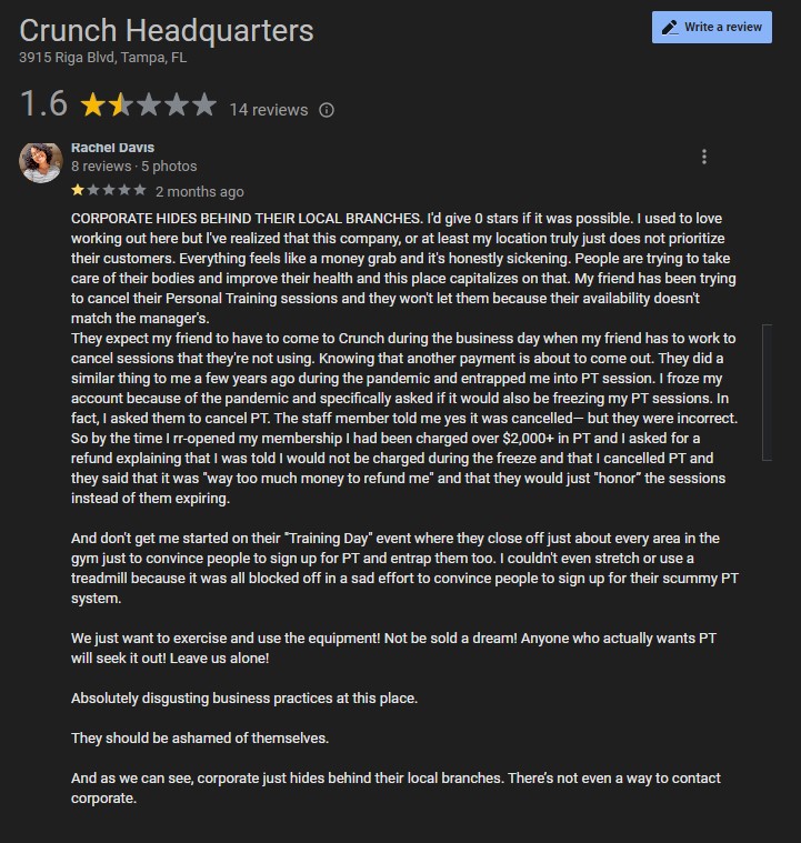 Crunch really needs to reevaluate who they’re putting in charge here, because she is single-handedly making this location feel unprofessional and uninviting. There are plenty of Crunch gyms where the staff actually acknowledges members — this one just isn’t one of them.