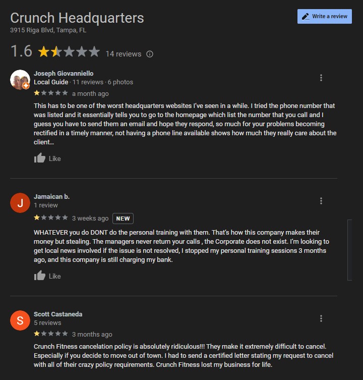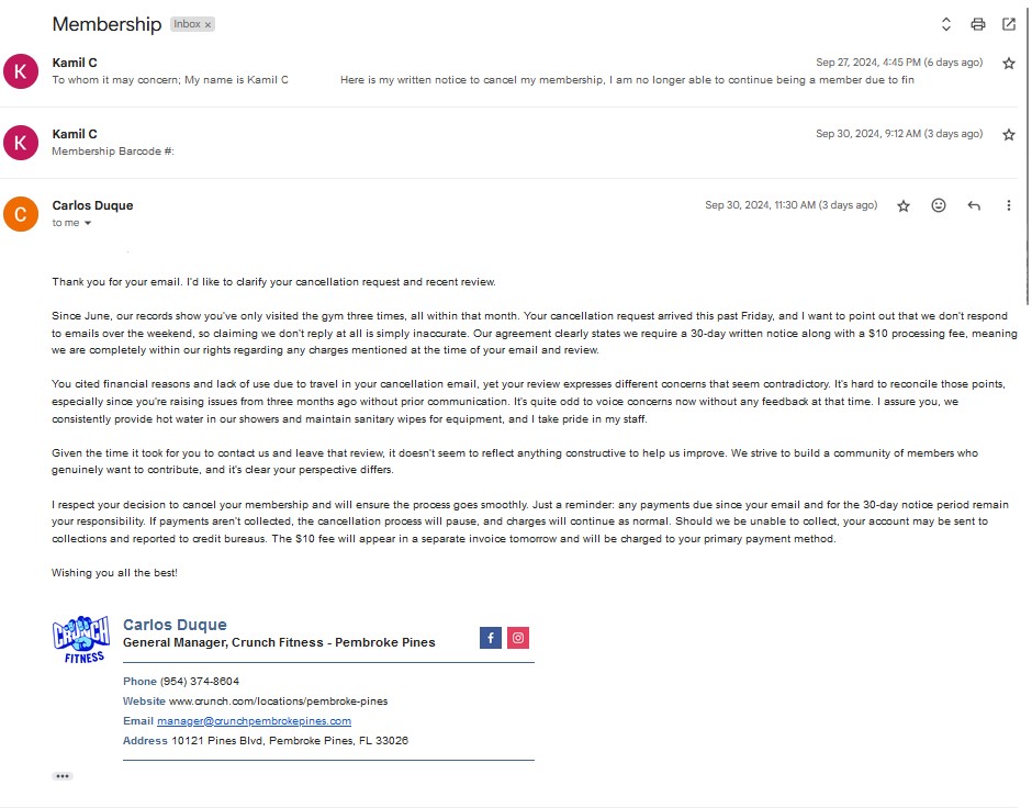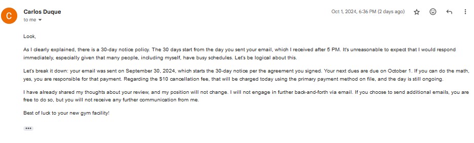The only way to get a response from the manager is to leave a review, was told my membership would be canceled then I have been ghosted never heard from Carlos D. again.