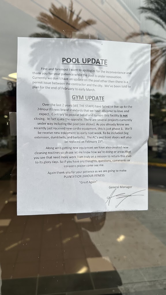 Welcome to 24 hour fitness plantation where you try to workout to become fit but go home with the bubonic plague from the showers. Where they promised to have pool open in February 2024 but it’s July and they haven’t even started repairing it and opening date is now June 2026. Last time they cleaned the restroom was the beginning of the pandemic in march 2020.
