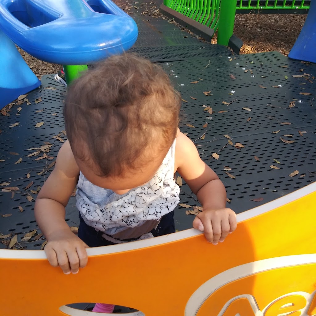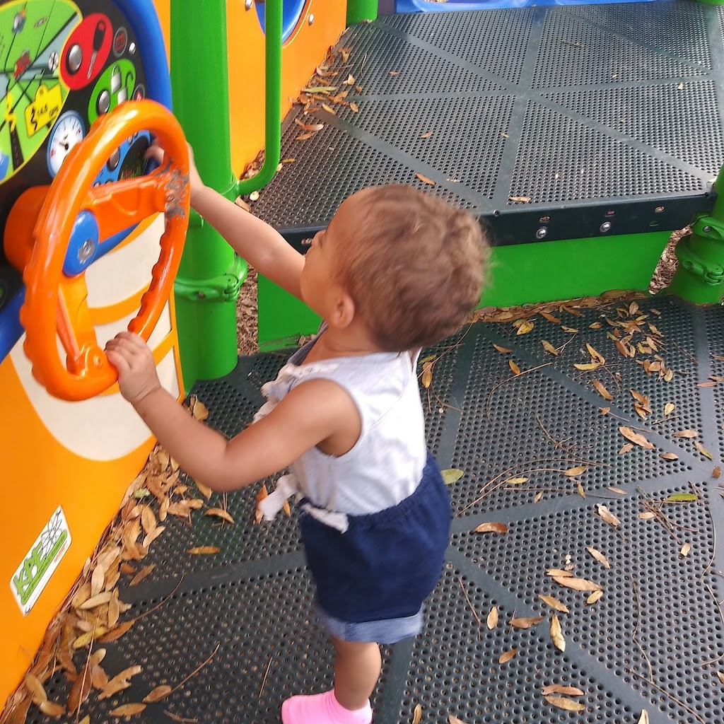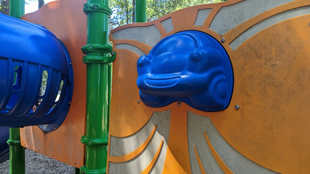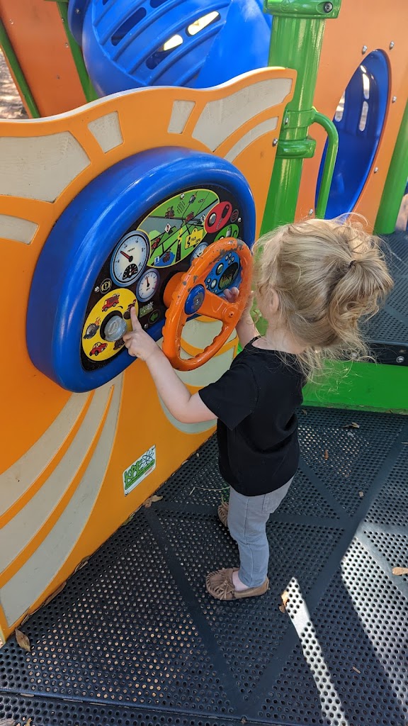 Very cute little kids park. It has a weird kid powered steering wheel sounds maker that sounds like a : firetruck, space ship, train, boat, or car. The slides are really nice and all in the shade of some lovely trees. There are some picnic tables too.