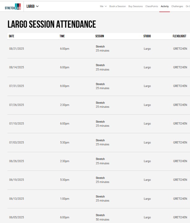 I have provided screenshots from my StretchLab client dashboard that clearly show my completed sessions at the Largo location. I will update this review if a resolution is reached.