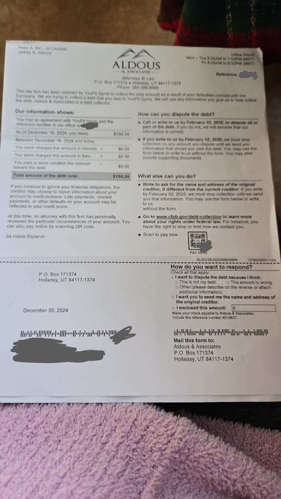 I ended up paying the the $194.34 balance from the Aldous & Associates P.L.L.C. collector in January 2025, but I'd urge YouFit to pay back that amount to me as, again, I only used their premises for 3 weeks.