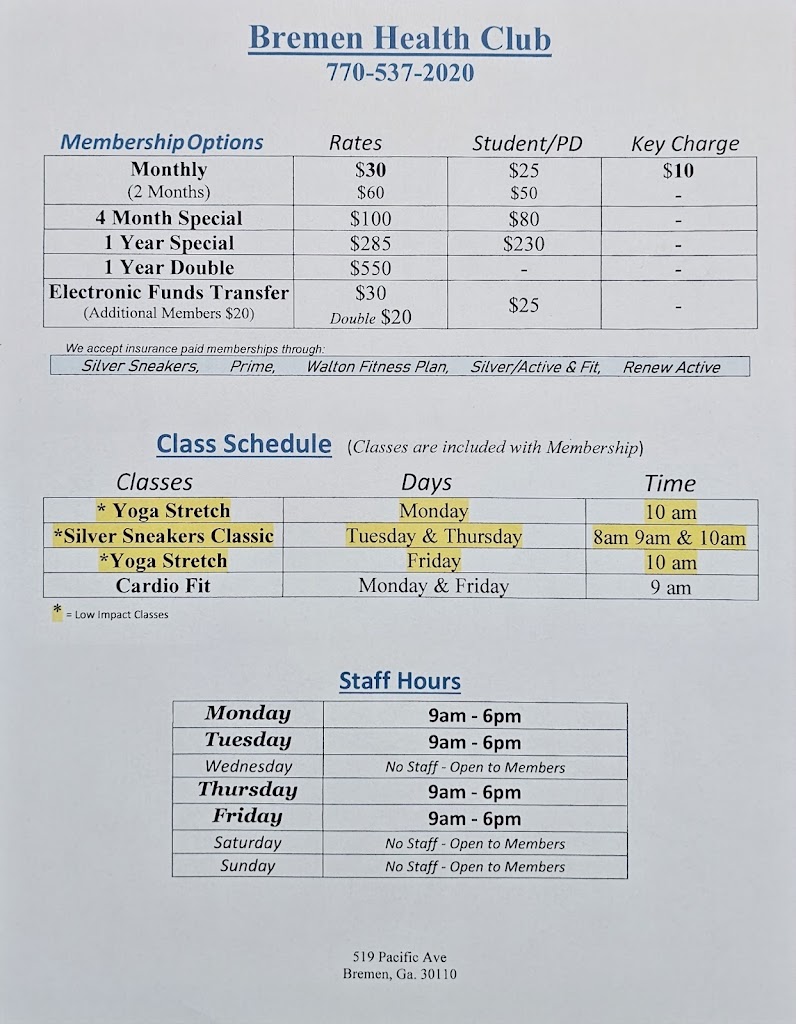 The Bremen Health Club is open 24 hours so I can exercise anytime I want. The Owner and Staff are friendly, helpful and professional.