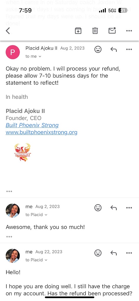 Great environment to work out at highly professional all the coaches. My personal coach is coach Quan he's an awesome coach very understanding and patient. When I'm not in the mood to work out he motivates me to do it and I do it. So I highly recommend Built Phoenix Strong the place to workout at to help whatever physical Fitness goals that you're trying to achieve