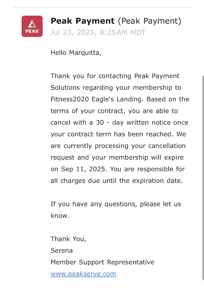 I’ve been trying to cancel my membership for 2 weeks. They finally replied to my email today. I was originally told I have to go to the gym to cancel. Once at the gym they said I have to call or email billing. I sent an email twice. It says wait up to 7 days for a response. We joined the gym last year in Spring. But they said I have to put in a 30 day notice after the year is up. Yet they’re saying I have to pay til September 11th. It’s July 23, 2025. So why are they not canceling it August 23rd? I HAVE NEVER ONCE USED THIS MEMBERSHIP. It’s a very small gym. But they do have a smoothie stand. The workers seem really nice. And they have child care room. But it’s $10 per child I believe and $10 to bring a friend to work out.