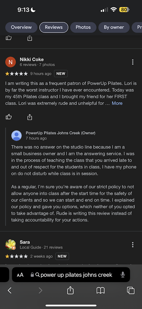 I have been going to this studio for a while. I started at the halcyon location but I will NOT be returning to the johns creek or halcyon or any other power up franchise after interactions with Lori. After learning that she is the owner, I refuse to support a Pilates studio that does not prioritize the safety and comfortability of their students. Very disappointing!!!!!!!!!