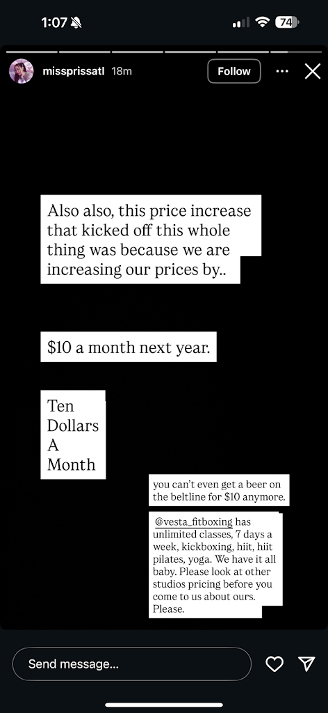 (Oh by the way the owner also said on her social media page that it was ridiculous of me to be making such a fuss over them only raising their prices by $10 a month. First of all, an extra $120 a year is nothing to sneeze at. Second of all, your prices were already too high BEFORE the increase. Lastly, you’re not providing more value for that increase, you’re just handing it directly over to your landlord. Why would I agree to pay your landlord more money when I can just keep my money? And thanks for sharing our private exchange with your 6,000 followers and showing them how you’re so out of touch of the prices normal people can afford for a gym.)