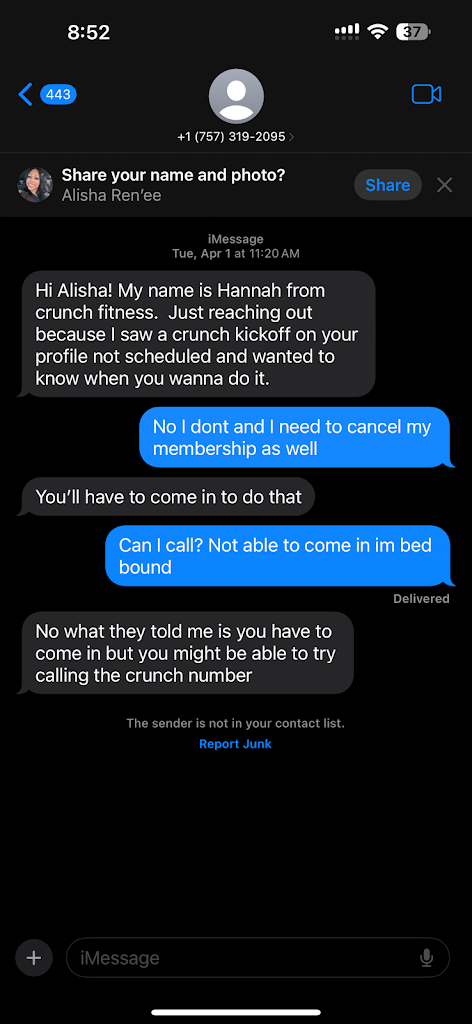 Everyone please be careful doing business with Crunch fitness. They run a disaster of a company. You can sign up online in a few clicks, but to cancel you have to come in person. I moved to NC before I could cancel in person and it has been a complete crap show since. I have called around a dozen times no answers and no call backs. I've sent close to a dozen emails to all of the provided addresses with no responses. I have sent several certified letters with no response. Their website provides inaccurate information and instructions. I have yet to hear from any managerial personnel on any of this matter. I have all of the receipts for all of my efforts and I will be pursuing legal action for breach of contract come November if nothing is settled by then. Do not comment on this post to try and save face; it's too late for that.