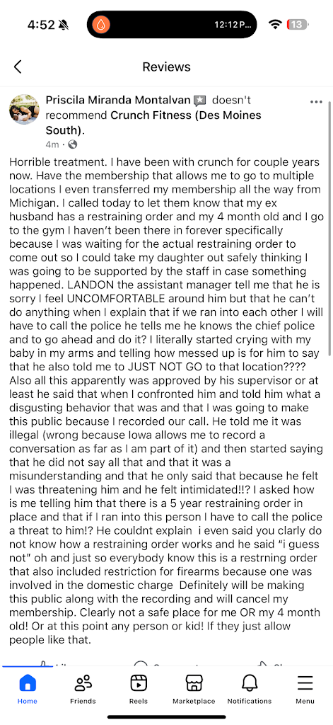 Also all this apparently was approved by his supervisor or at least he said that when I confronted him and told him what a disgusting behavior that was and that I was going to make this public because I recorded our call. He told me it was illegal (wrong because lowa allows me to record a conversation as far as I am part of it) and then started saying that he did not say all that and that it was a misunderstanding and that he only said that because he felt I was threatening him and he felt intimidated!!? I asked how is me telling him that there is a 5 year restraining order in place and that if I ran into this person I have to call the police a threat to him!? He couldnt explain i even said you clarly do not know how a restraining order works and he said "i guess not" oh and just so everybody know this is a restrning order that also included restriction for firearms because one was involved in the domestic charge Definitely will be making this public along with the recording and will cancel my membership. Clearly not a safe place for me OR my 4 month old! Or at this point any person or kid! If they just allow people like that.