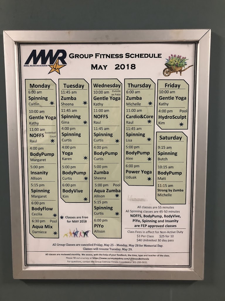 An amazing fitness facility on NSA Bethesda. Olympic size pool, different courts, huge weight room, aerobics room, spin room, and many more. Towels and locker rooms available.