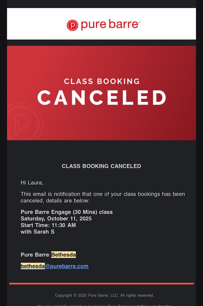 Buyer beware…Do not expect the former customer service, professionalism or Pure Barre experience a client used to receive from the previous managers/owners. Current owner/manager isn’t aligned with or honors certain aspects of the former PB Bethesda managment or corporate brand.