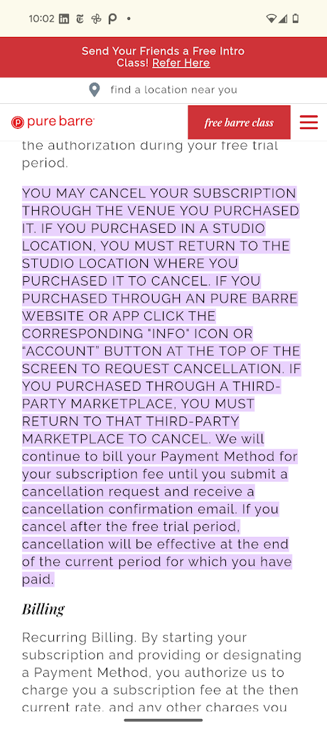I am extremely disappointed with Pure Barre. Their website is completely misleading. They advertise "no commitment - Cancellation will be effective at the end of the current period for which you have paid" and make it seem like you can cancel anytime—this is NOT true. Once you sign up, you find out there is actually a 30-day cancellation period, which is nowhere clearly stated during sign-up. This is blatant false advertising and completely dishonest.