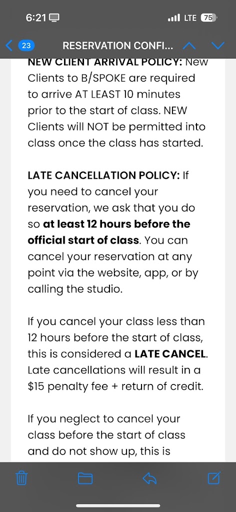 Great set up and good classes but really poor in person interaction and customer service. I had attempted to take a yoga class this past week and was turned away because I was 1 minute past their late policy (which is 5 minutes?!?!) I have never heard a short late entry policy. I tried to contact their customer service to see if I could rebook (no reply) and was also charged a $20 no show policy even though I did actually show up. Attempted to contact their customer service and almost a week has past and no contact. Wonβt be going back. It also says NO WHERE when you make a reservation about their late policy.