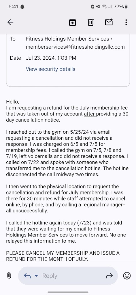 Attempted to cancel my membership on 5/25/24.. here we are in August and I'm STILL getting billed. I've emailed multiple times, called 5 times, and gone down there in person which was a complete waste of time. The last email was on 7/23 and they finally emailed me back today AFTER charging my card again! This place is a scam, I wouldn't trust them with your bank info.