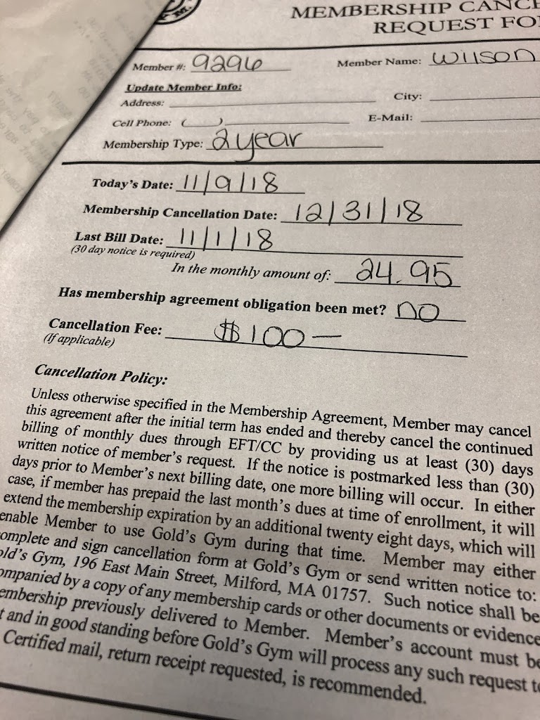 Golds Gym won't actual cancel your membership even when you go in sign the paper to cancel. Its been two months since canceling and Milford Gold Gym is still taking money out. Do not trust these people with your Money