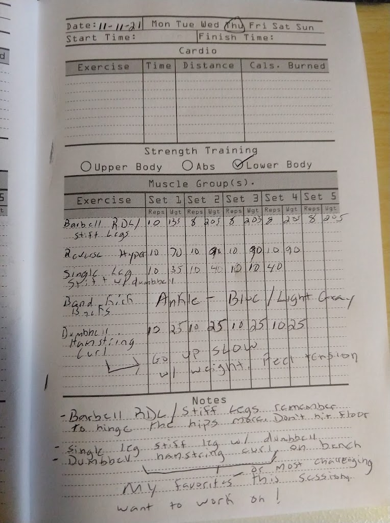 I have had the opportunity to utilize the personal training service, and am continually learning new movements and reaching strength goals. I included a photo example from a workout log book that shows just some movements that are taught.