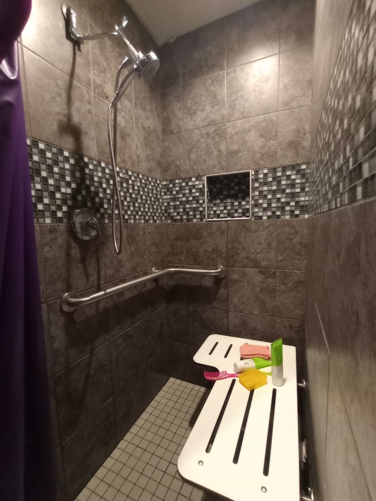 The small handicap shower with downward slant leaves the walkway and bottom of my wheelchair soaked, which tracks into the distant dressing room. The shower head is also WAY too high and, while it is detachable, there's nowhere to put it once you take it down. They also installed the towel hanger at standing height, instead of handicap height so that became useless and I had to get creative.