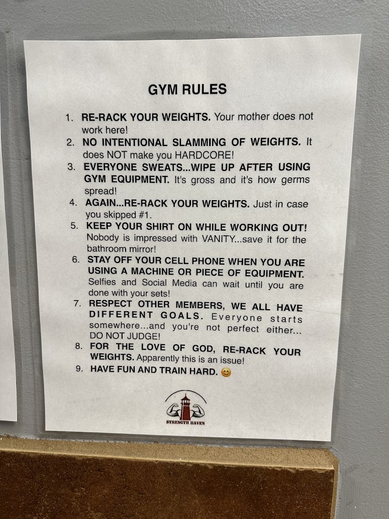 Had the best experience at Strength Haven. My boyfriend and I are in town for a week and wanted a place to workout for the week. We picked strength haven and are so thankful we did. The staff was wonderful, and kind. They also had a variety of different machines, which was really nice to use. Overall my experience with strength haven was a 10/10 π€©
