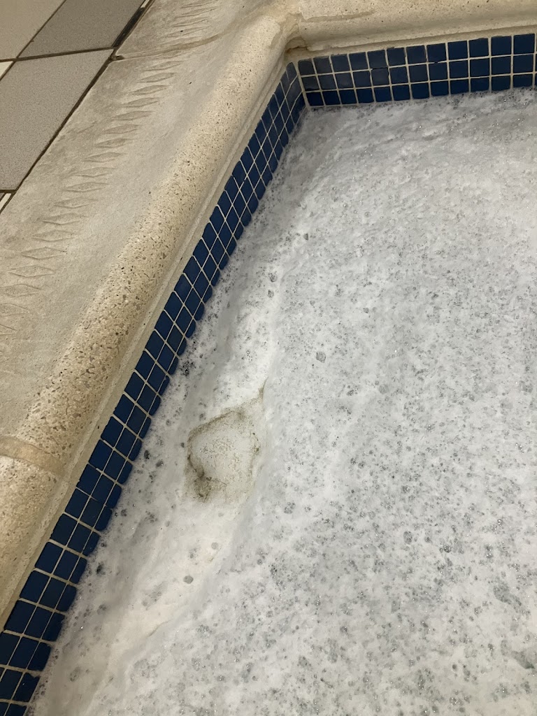 The hot tub has white soap bubbles in it all the time once it’s turned on. It must be from the chemicals they use, as it’s not normal to have that quantity (or any) soap bubbles in a hot tub. It’s recommended they change what they use to clean the hot tubs at all of their locations to stop this from happening. Dirt floats on top of the soap bubbles.