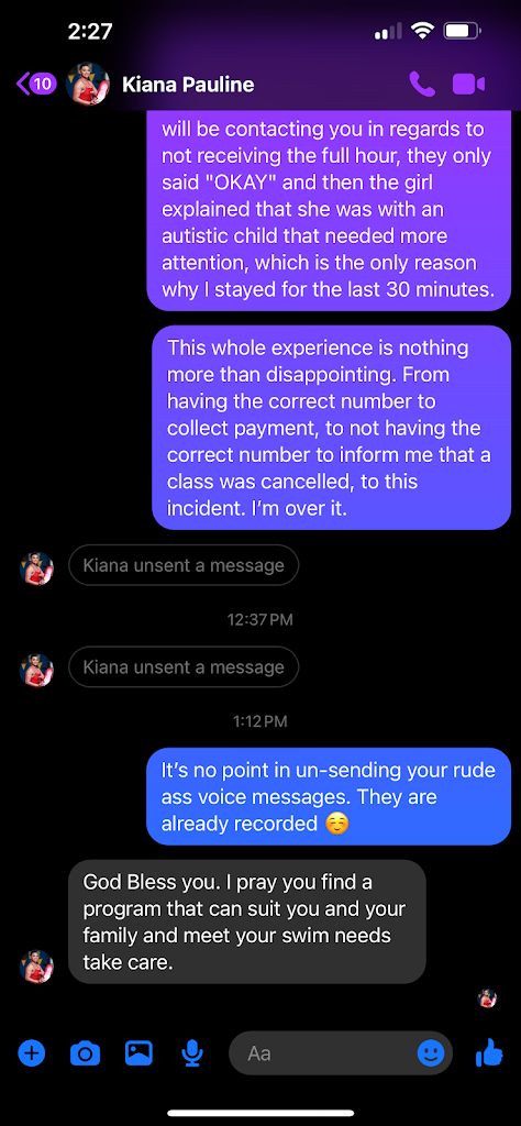 STRIKE #3: KIANA is as UNPROFESSIONAL as it get. She response back to me a few times via messenger and voice messenger. She was extremely RUDE in voice messages, which she deleted once I called her out on it. She made it seem as if I paid for group lessons and was expecting private lessons treatment out of spite. MAAM, you offered that as a courtesy to the miscommunication, so that’s what I expected.