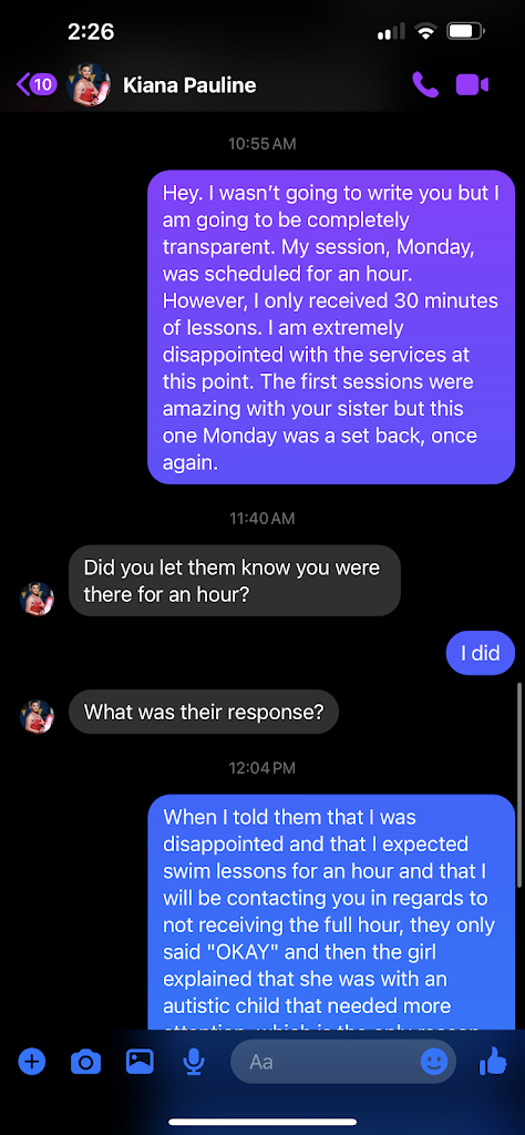 STRIKE #2: I arrived to my second session, which was scheduled for an hour. I spent time in the pool for 30 minutes, with no instructions or anything. I notified both instructors that I was scheduled for an hour and was not receiving any instructors. One instructor informed me that she was giving lessons to a child who was Autistic and that this particular child’s lessons were only 30 minutes. The other instructor, continued to train his person. As a person who has worked with children and has a child of my own, I became extremely understanding and waited until the child’s lessons were over to start mine.